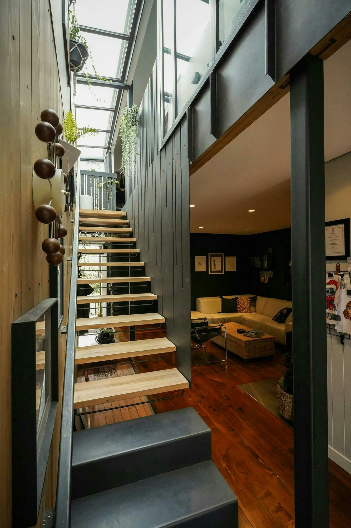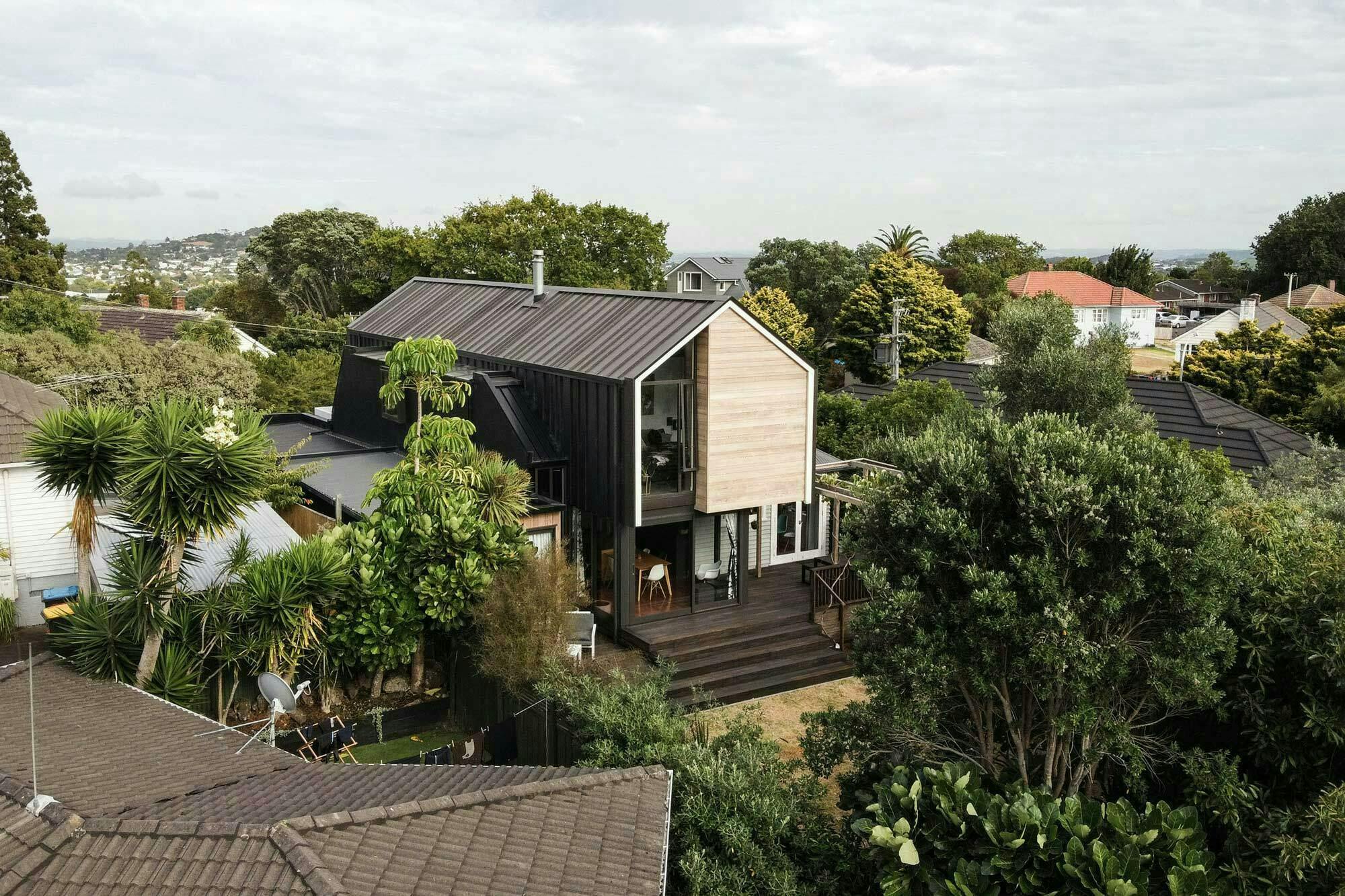 A modest budget required intelligent and creative solutions to juxtapose a contemporary extension which comfortably engages with the original’s vernacular. Existing slabs and structure were carefully utilised and integrated by way of stitching the existing with new, contemporary forms. The colour and material palette define the addition which comprises of three elements strategically placed to best utilise the original structure; a bold extruded gable wrapped in a raw corten standing seam spans over the original footprint of the house, a secondary Cedar clad ground floor extrusion extended the existing detached garage, and thirdly a double height space linking the two provides vertical circulation (with an 8m long skylight above channelling natural light to the living areas below).