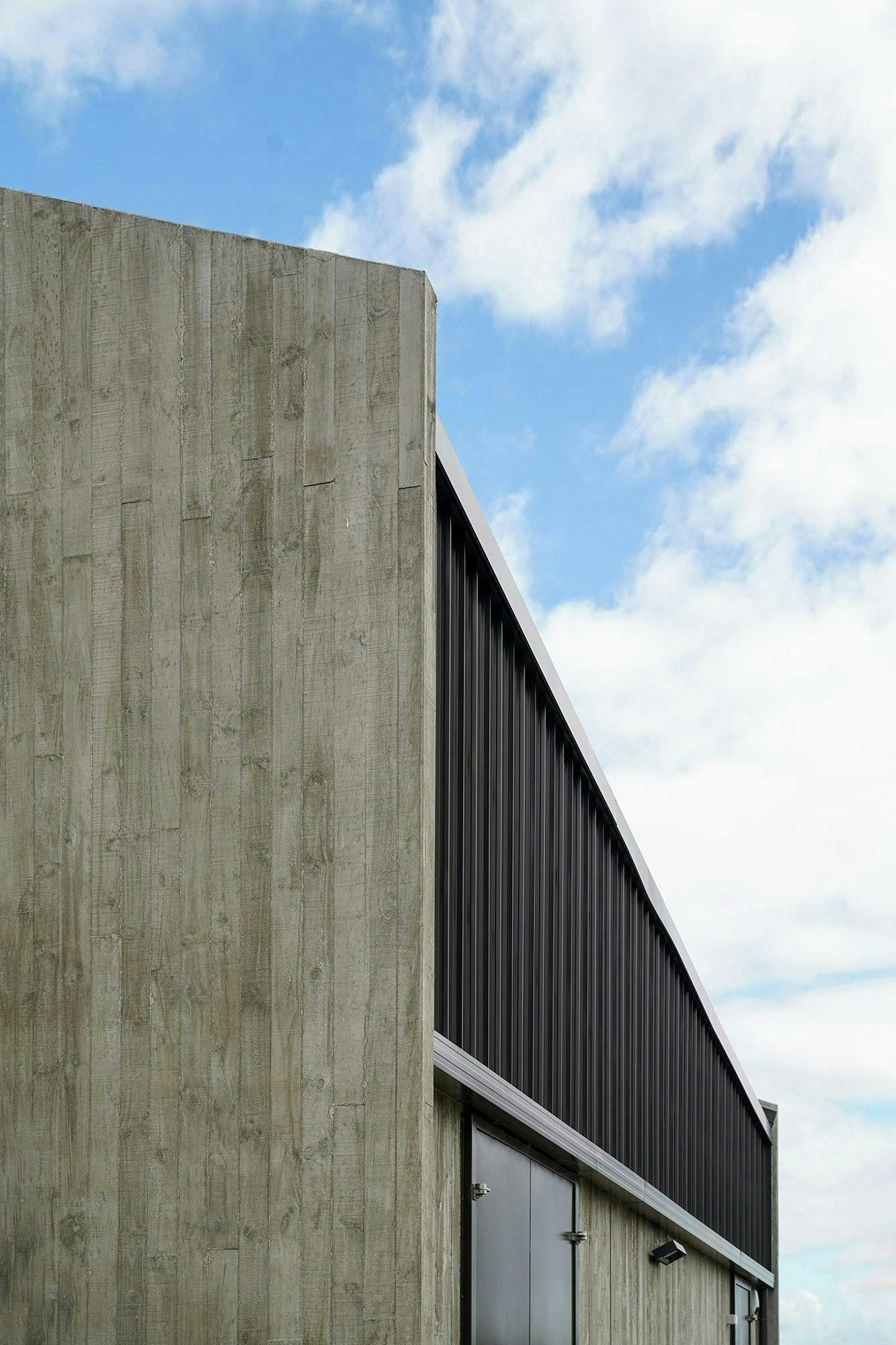 The result is an aesthetic that is expressed in a functional way with patterned concrete and a utilitarian front yard, while the pitched metal roof and apertures are forms more residential in nature with dynamic roof geometry creating a point of interest.